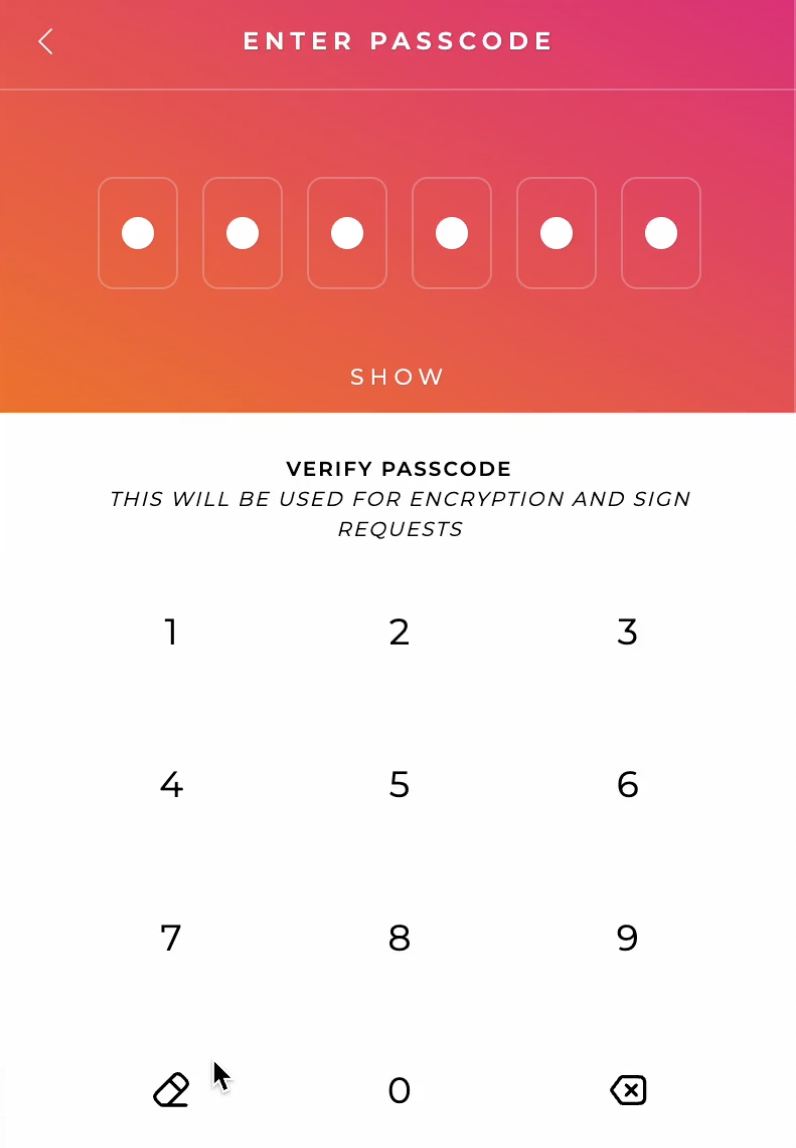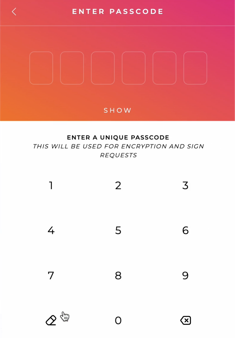 On the next page, enter a six-digit passcode you won’t forget. After entering the first time, you will be asked to confirm by entering your passcode again. You can click Show under the passcode digit boxes to check you’ve correctly entered your digits of choice if you need.