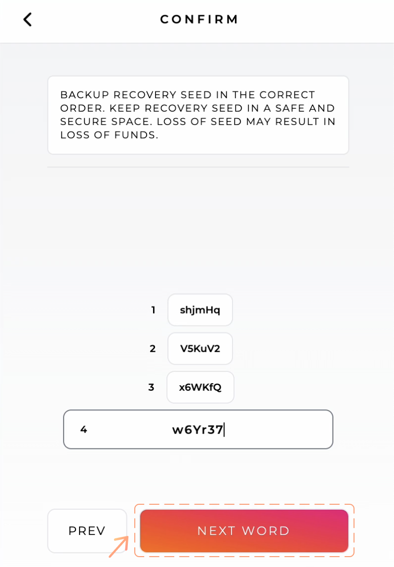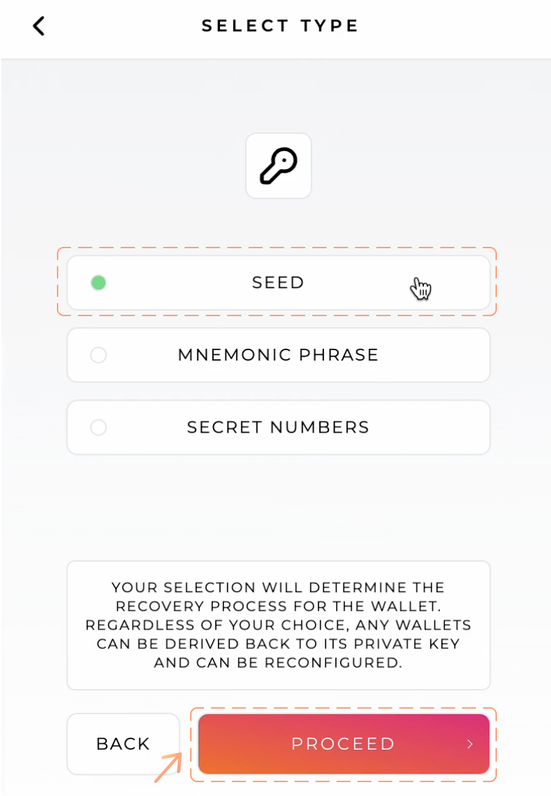 In this example, we’ll use SEED PHRASE, but the process is largely the same for any backup option.