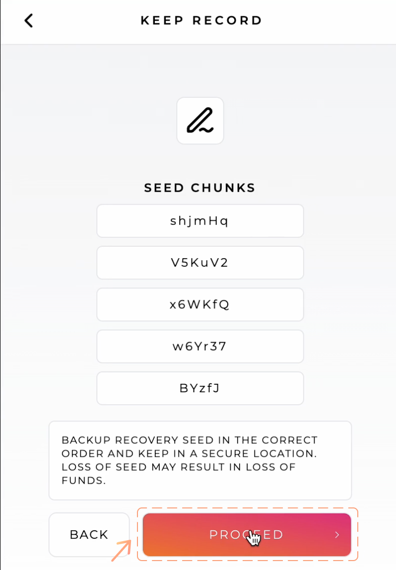 Choose your preferred recovery process for your wallet; this will be a list of words/numbers you'll have to remember to keep your funds accessible.