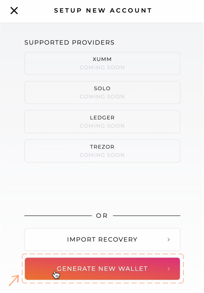 The next page will present a number of options for linking to existing wallets, as well as recovering an existing wallet in Crossmark. To create a new wallet, you’ll want to click the GENERATE NEW WALLET button.